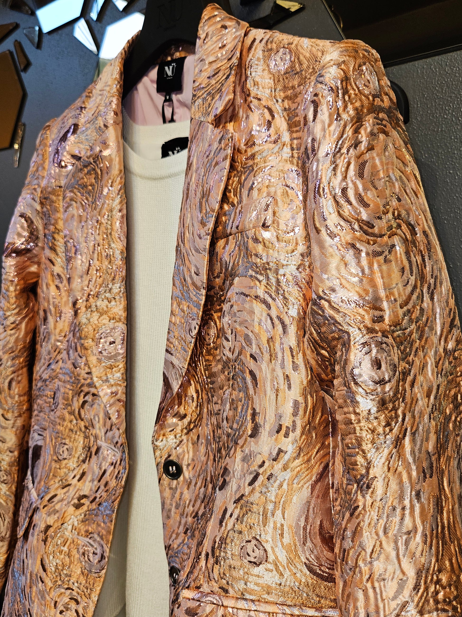 - Rosaguld Tekstureret Blazer: Iøjnefaldende metallisk blazer med indviklet hvirvelmønster