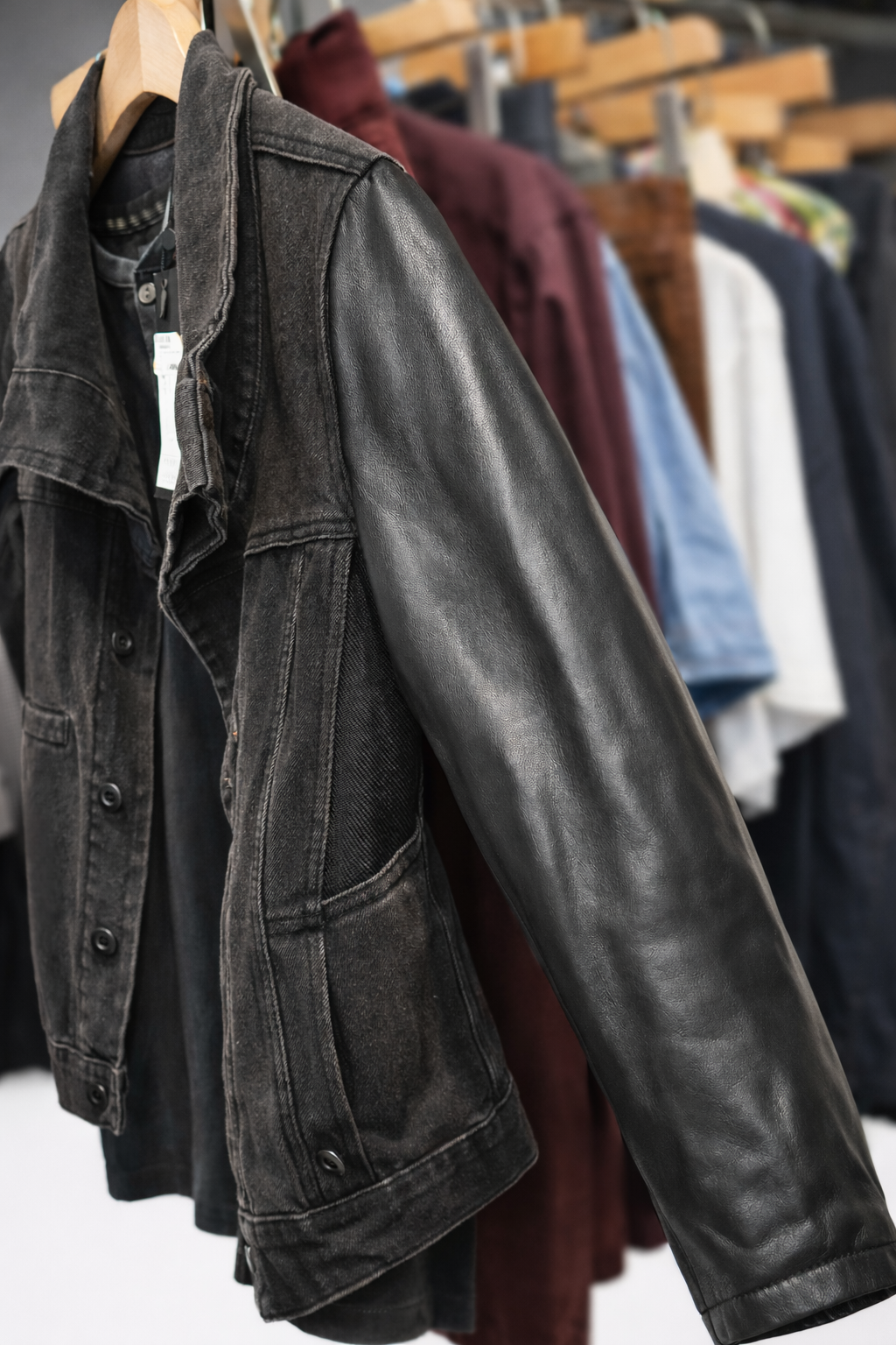 - Coster denim jacket in grey (Size 40) – featuring genuine sheep leather sleeve panels for a refined, contemporary edge