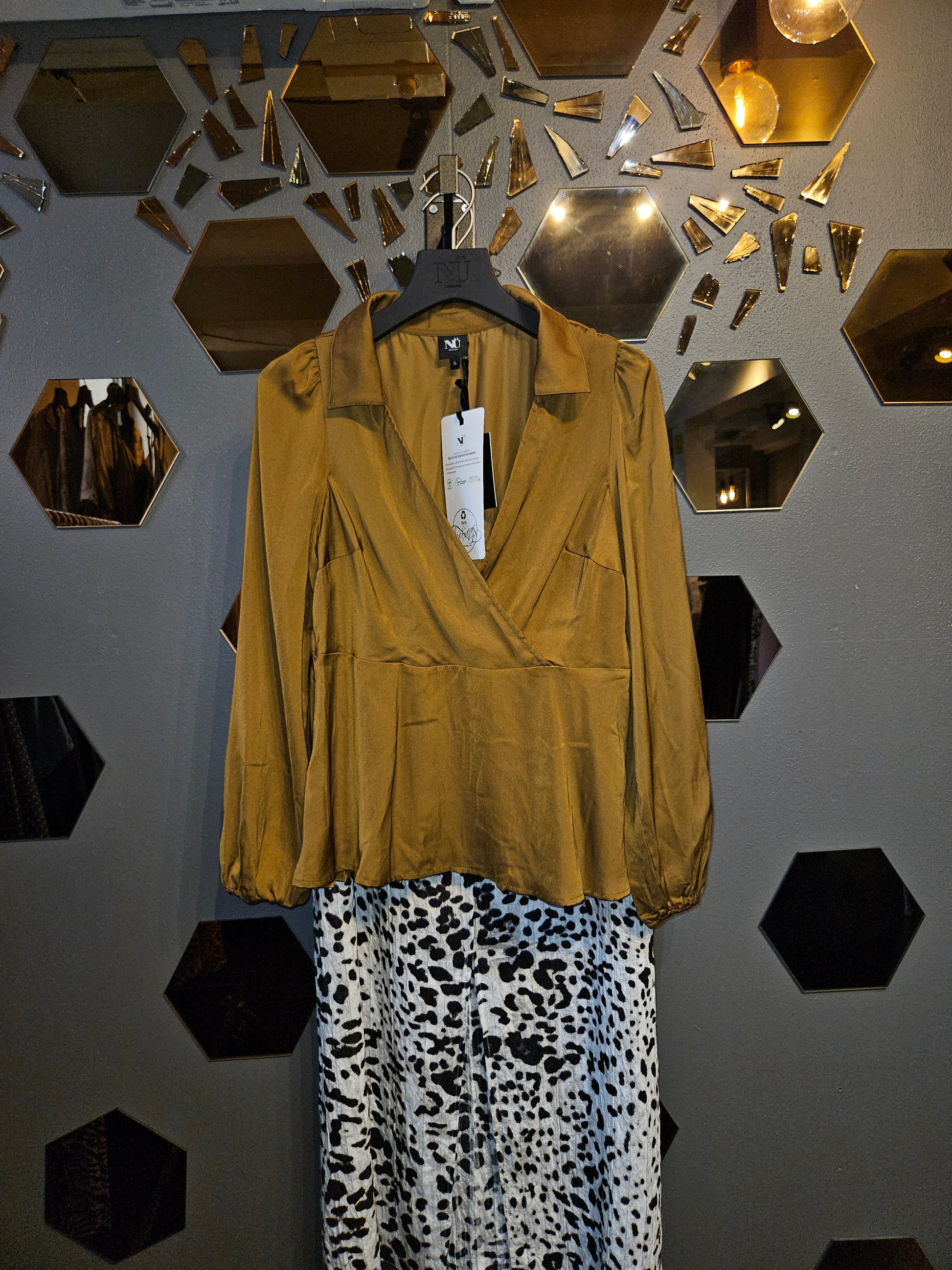 Sofistikeret olivenfarvet slå-om-bluse med en elegant draperet silhuet. Dette alsidige stykke tøj har en flatterende V-udskæring og et flagrende design, der ubesværet går fra hverdags- til aftenbrug. Den fyldige olivenfarve tilføjer en jordnær elegance til enhver garderobe.
